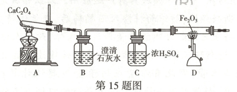 15. (6分)已知草酸钙(CaC₂O₄)加热易分解:$CaC₂O₄\xlongequal{\triangle}CaO+CO↑+CO₂↑。$为验证分解产物中既有CO又有CO₂,小明设计了如图所示的实验装置,请回答下列问题。