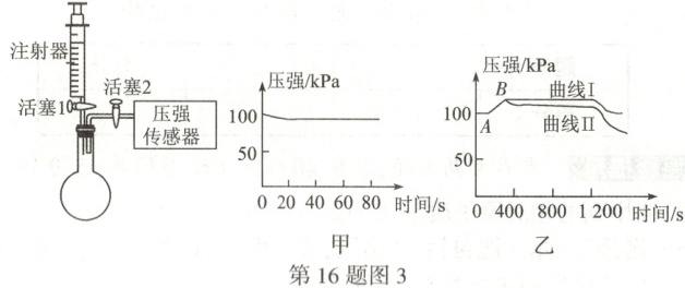 步骤2:打开活塞1和活塞2,用注射器迅速将适量等体积的水和澄清石灰水分别注入集满CO₂的烧瓶中,关闭活塞1。一段时间后,同时振荡烧瓶,用压强传感器测得压强随时间的变化图像如图乙所示。