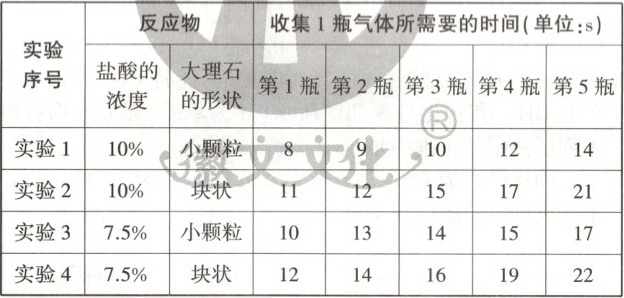(3)①对比表格中的实验数据,实验1和2的盐酸的浓度和体积均相同,大理石的形状不同,通过对比数据可知,大理石的形状对制取CO₂快慢有影响。