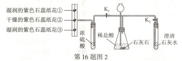(4) 图2所示的实验(夹持装置已省略):检查装置的气密性后,打开K₁,关闭K₂,往锥形瓶中加入试剂。一段时间后观察到③处纸花先变红,①处纸花后变红,②处纸花不变红,说明CO₂具有的性质是______;当关闭K₁、打开K₂时,同学们发现试管中的澄清石灰水不变浑浊,你认为可能的原因是______(写一点即可)。