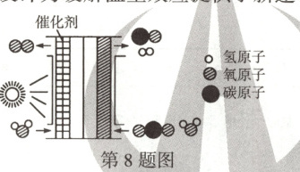 8.A 【解析】本题主要考查微观反应模型的解读。根据微观示意图,“人造树叶”模拟光合作用的化学方程式是$CO_2+H_2O\stackrel{催化剂,光照}{=}CO+O_2+H_2$。