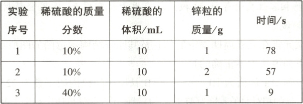 ②对比实验数据可知,稀硫酸的质量分数增大时,收集相同体积的氢气所需的时间显著缩短,因此对锌与稀硫酸反应快慢影响较大的因素是稀硫酸的质量分数。