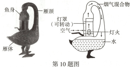 10. (2024·安徽)如图所示的是我国西汉青铜雁鱼灯及其示意图。灯油燃烧时,烟气通过鱼身和雁颈导入雁体内水中,减少对室内空气的污染。下列说法中不正确的是 (