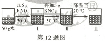 12. 已知 KNO₃ 在 20℃、30℃时的溶解度分别为 31.6 g、45.8 g。某同学按如图所示的步骤进行实验,下列说法中正确的是 (