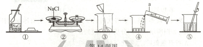 14. (6 分)某同学配制 120 g 溶质质量分数为 10%的氯化钠溶液的过程如图所示,回答下列问题。
