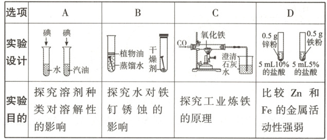D.比较锌和铁的金属活动性强弱,应将相同质量的锌粉和铁粉加入相同体积、相同浓度的稀盐酸中,比较反应的剧烈程度,故D不符合题意。