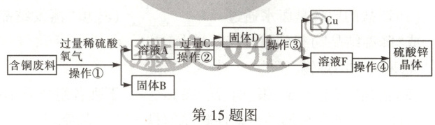 15. (6分)回收利用废旧金属可减少资源浪费、保护环境。某工厂利用含铜废料(含Cu、Zn及不溶于水、不参加反应的其他杂质)制取铜并得到硫酸锌晶体(ZnSO₄·7H₂O),主要流程如图所示,硫酸锌晶体在工农业上有广泛用途。回答下列问题。