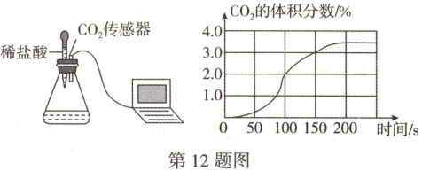 12.(2024·兰州)为测定某氢氧化钠固体是否变质,某化学兴趣小组的同学取一定量的样品配制成溶液,加入锥形瓶中,再逐滴加入稀盐酸至过量,并利用传感器测定CO₂的含量,如图所示。下列结论中不正确的是(