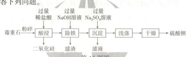 15.(2024·武汉,6分)硫酸钡是白色固体,医疗上常用作透视肠胃的内服剂。以毒重石(主要成分是碳酸钡,还含少量氧化铁和二氧化硅)为原料生产硫酸钡的工艺流程如图所示,回答下列问题。