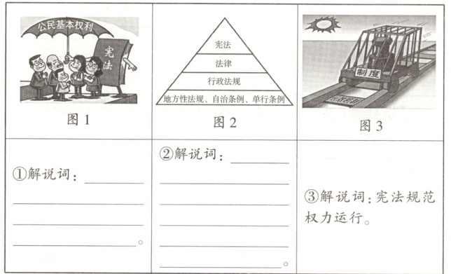 (1)①图1解说词:宪法规定广泛的公民基本权利并规定实现公民基本权利的保障措施。 ②图2解说词:宪法是其他法律的立法基础和立法依据,其他法律是根据宪法制定的,不得与宪法的原则和精神相违背。(4分)