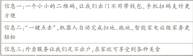 4.A 【解析】本题考查创新的重要性。“手机扫码支付更方便、智能家电让家务更轻松、在家就可享受到各种美食”表明创新让生活更美好,我们的生活将因创新变得更加便捷、舒适和丰富多彩,故A符合题意;材料主要体现创新让生活更美好,并未体现“创新驱动是国家命运所系”“时代发展呼唤创新”“创新是改革开放的生命”,故B、C、D不符合题意。