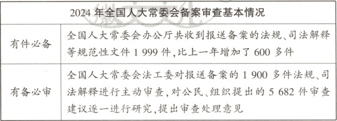 材料一 法治兴则民族兴,法治强则国家强。法治的前提是科学立法,下列是全国人大常委会在关于完善和加强备案审查制度的决定通过一年多来,为法规“校准”的有关信息。