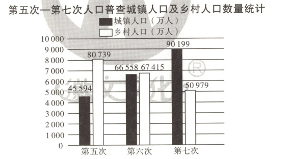 2.B 【解析】本题考查我国的人口现状。题干中通过第五次、第六次、第七次人口普查显示,我国城镇人口越来越多,农村人口越来越少,这说明我国城镇化建设成绩斐然,B符合题意;A、C、D在题干中都不能体现。