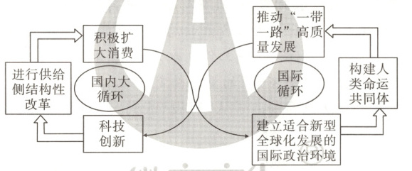 11.C 【解析】本题考查中国积极谋求发展。从图示可以看出,一方面要通过供给侧结构性改革、扩大消费、科技创新等举措,畅通国内大循环;另一方面积极推动“一带一路”高质量发展,构建人类命运共同体,打造有利于新型全球化发展的国际环境,体现了我国构建以国内大循环为主体、国内国际双循环相互促进的新发展格局,C符合题意。A、B、D说法正确,但都不符合题意。