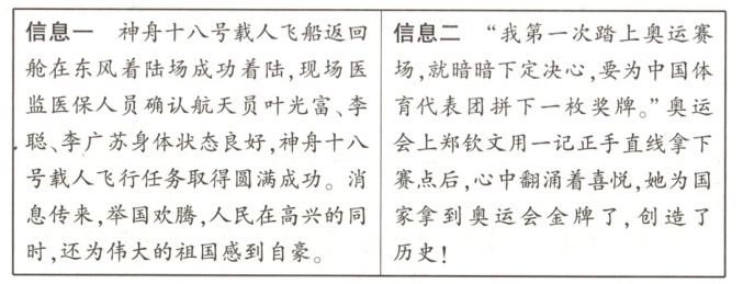 (1)运用“做情绪情感的主人”相关知识,简要说明信息一中“高兴”与“自豪”有何区别。(2分)