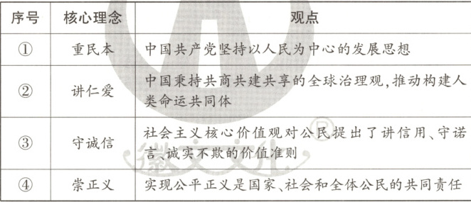 2.C 【解析】中国共产党坚持以人民为中心的发展思想,体现了重民本,①正确;仁爱是宽仁慈爱,爱护、同情的感情;与构建人类命运共同体无关,②错误;社会主义核心价值观对公民提出了讲信用、守诺言、诚实不欺的价值准则,体现了守诚信,③正确;实现公平正义是国家、社会和全体公民的共同责任,体现了崇正义,④正确。