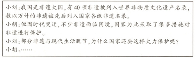 (2)因为非遗是古代流传下来的民间技艺、工艺、艺术等非实体的存在,同样是中华优秀传统文化的重要组成部分,积淀着中华民族最深层的精神追求,代表着中华民族独特的精神标识,为中华民族伟大复兴提供精神动力,所以国家必须要大力加以保护。(4 分)