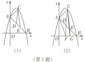 1. 中考新考法 最值问题 (甘肃模拟)如图(1),抛物线$ y=ax^2+3x+c $与坐标轴交于点$ A(0,4) $和点$ B $(点$ B $位于$ x $轴正半轴),点$ C(2,6) $在抛物线上,$ D,E $为线段$ AB $上的动点(点$ D $在点$ E $的左侧),$ DE=\sqrt{2} $,连接$ AC,CD,CE $.