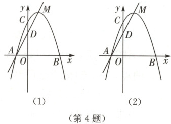 4. 如图,抛物线$ y = -x^2 + bx + c $经过$ A(-1,0) $,$ C(0,3) $两点,并交$ x $轴于另一点$ B $,$ M $是抛物线的顶点,直线$ AM $与$ y $轴交于点$ D $.