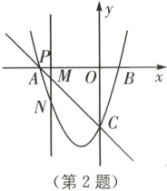 2. 如图,二次函数 $ y = x^2 + bx + c $ 的图象交 $ x $ 轴于点 $ A $,$ B $,交 $ y $ 轴于点 $ C $,点 $ B $ 的坐标为 $ (1, 0) $,对称轴是直线 $ x = -1 $,点 $ P $ 是 $ x $ 轴上一动点,$ PM \perp x $ 轴,交直线 $ AC $ 于点 $ M $,交抛物线于点 $ N $。