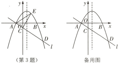 3.如图,在平面直角坐标系$ xOy $中,抛物线$ y = ax^2 - 2ax - 3a(a < 0) $与$ x $轴交于$ A $,$ B $两点(点$ A $在点$ B $的左侧),经过点$ A $的直线$ l:y = kx + b $与$ y $轴负半轴交于点$ C $,与抛物线的另一个交点为$ D $,且$ CD = 4AC $.