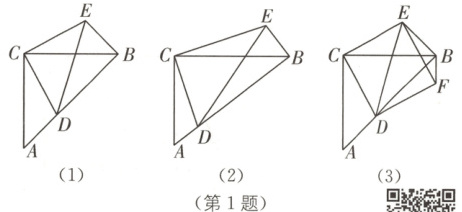 。[类比迁移](2)如图(2),当$ m \neq 1 $时,猜想$ AD $与$ BE $之间的位置关系和数量关系,并证明猜想。
