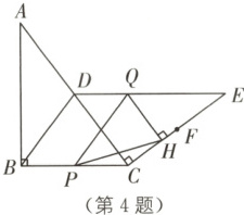 4. (青岛李沧区志远中学三模)如图,已知:在$ Rt\triangle ABC $中,$ \angle ABC = 90° $,$ AB = 8 \, cm $,$ BC = 6 \, cm $,$ D $是$ AC $边上的中点。过点$ C $作$ AC $的垂线$ CE $,过点$ D $作$ BC $的平行线,交$ CE $于点$ E $,点$ Q $从点$ E $出发沿$ ED $方向往点$ D $匀速运动,速度为$ 2 \, cm/s $,同时点$ P $从点$ B $出发沿$ BC $方向往点$ C $匀速运动,速度为$ 1 \, cm/s $,当一点到达终点,另一点也随之停止。连接$ PQ $,过点$ Q $作$ QH \perp CE $于点$ H $,连接$ PH $,$ F $是线段$ CE $的中点。设运动时间为$ t(s) $,解答下列问题:
