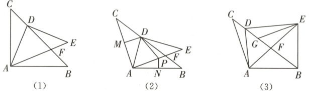 (2)如图(2),过点$D$作$DM \perp AC$于点$M$,点$N$为边$AB$上一点,过点$N$作$NP \perp AB$交$AE$于点$P$,连接$DP$,若$AM = AN$,求证:$DM + PN = DP$;