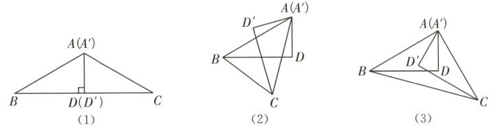 [操作探究]如图(1),先将$\triangle ADB$和$\triangle A'D'C$的边$AD$,$A'D'$重合,再将$\triangle A'D'C$绕着点$A$按顺时针方向旋转,旋转角为$\alpha(0° < \alpha < 180°)$,旋转过程中$\triangle ADB$保持不动,连接$BC$(如图(2))。