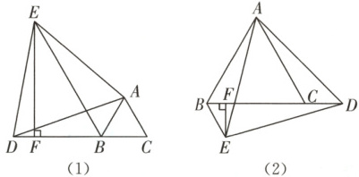 (1)若$\alpha = 60°$,如图(1),当点$D$在$CB$延长线上时,易证:$BF = DF + BC$;如图(2),当点$D$在$BC$延长线上时,试探究线段$BF$,$DF$,$BC$之间存在怎样的数量关系,请写出结论,并说明理由。