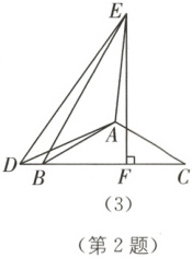 (2)若$\alpha = 120°$,点$D$在$CB$延长线上,如图(3),猜想线段$BF$,$DF$,$BC$之间又有怎样的数量关系?请直接写出结论,不需要证明。