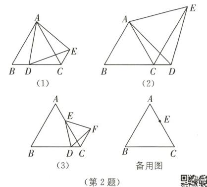 ②如图(2),当点$D$在线段$BC$的延长线上时,连接$CE$.请再次探究$CA$,$CE$和$CD$之间的数量关系,并说明理由.