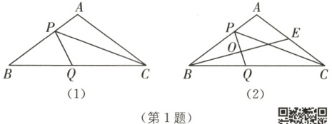 (3)如图(2),$E$是$AC$的中点,连接$BE$,与$PQ$交于点$O$,是否存在某一时刻$t$,使得$PQ \perp BE$? 若存在,请求出$t$的值;若不存在,请说明理由.