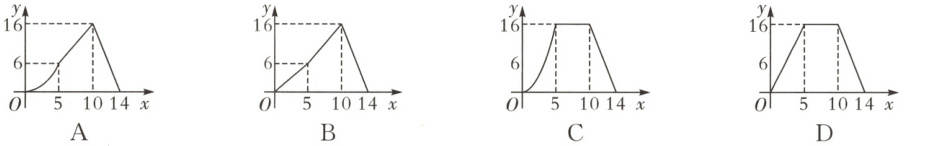 ∴y = $\frac{1}{2}$AH·PH = $\frac{1}{2}$×8·(14 - x) = - 4x + 56,且当x = 14时,y = 0.故B,C,D不正确,A正确.故选A.
