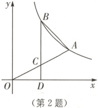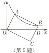 5. (长春绿园区二模)如图,在平面直角坐标系中,矩形$ OABC $的顶点$ A $,$ B $在双曲线$ y = \frac{k}{x} (x > 0) $上,$ BC $与$ x $轴交于点$ D $。若点$ A $的坐标为$ (1, 2) $,则点$ B $的坐标为(
