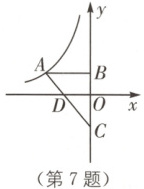 7. 如图,$ A $是反比例函数$ y = \frac{k}{x} $图象上一点,$ AB \perp y $轴于点$ B $,$ C $是$ y $轴负半轴上一点,且满足$ OC : OB = 3 : 2 $,连接$ AC $交$ x $轴于点$ D $,若$ S_{\triangle ABC} = 25 $,则$ k = $
