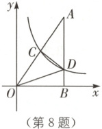 8. (孝感中考)如图,$ Rt \triangle AOB $的一条直角边$ OB $在$ x $轴上,双曲线$ y = \frac{k}{x} (x > 0) $经过斜边$ OA $的中点$ C $,与另一直角边交于点$ D $。若$ S_{\triangle OCD} = 9 $,则$ S_{\triangle OBD} $的值为$ $