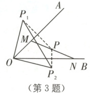 3. 如图,$ \angle AOB = 45° $,点$ M $,$ N $分别在射线$ OA $,$ OB $上,$ MN = 8 $,$ \triangle OMN $的面积为$ 24 $,$ P $是直线$ MN $上的动点,点$ P $关于$ OA $对称的点为$ P_1 $,点$ P $关于$ OB $对称的点为$ P_2 $,当点$ P $在直线$ NM $上运动时,$ \triangle OP_1P_2 $的面积最小值为$ \boldsymbol{$