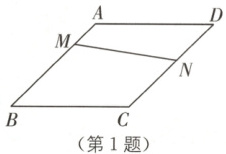1. 如图,在菱形$ ABCD $中,$ AB = 8 $,动点$ M $从点$ A $出发,以每秒$ 1 $个单位长度的速度沿$ AB $向点$ B $运动;动点$ N $从点$ C $出发,以每秒$ 2 $个单位长度的速度沿$ CD $向点$ D $运动。若运动$ t $秒后,四边形$ AMND $是平行四边形,则$ t $的值为(