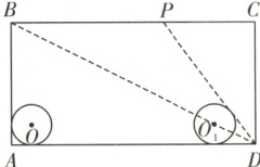 (第二步:作辅助线,找到相似关系,进而求得点$ P $移动的距离)设直线$ OO_1 $与$ AB $交于点$ E $,与$ CD $交于点$ F $,$ \odot O_1 $与$ AD $相切于点$ G $,连接$ O_1G $,若$ PD $与$ \odot O_1 $相切,切点为$ H $,则$ O_1G = O_1H $。连接$ O_1H $,易得$ \triangle DO_1G \cong \triangle $
