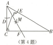 4. (盘锦第一完全中学三模)如图,在$ Rt\triangle ABC $中,$ \angle ACB = 90° $,$ \angle ABC = 30° $,$ AC = 6 $,按下列步骤作图:①在$ AC $和$ AB $上分别截取$ AD,AE $,使$ AD = AE $;②分别以点$ D $和点$ E $为圆心,以大于$ \frac{1}{2}DE $的长为半径作弧,两弧在$ \angle BAC $内交于点$ M $;③作射线$ AM $交$ BC $于点$ F $。若点$ P $是线段$ AF $上的一个动点,连接$ CP $,则$ CP+\frac{1}{2}AP $的最小值是(
