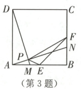 3. (杭州钱塘区三模改编)如图,在正方形$ ABCD $中,点$ M,N $分别在边$ AB,BC $上(不与顶点重合),且满足$ AM = BN $,连接$ AN,DM $交于点$ P $。$ E,F $分别是边$ AB,BC $的中点,连接$ PE,PF $,若正方形的边长为$ 8 $,则$ PE+\frac{1}{2}PF $的最小值为(
