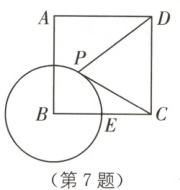 7. 如图,正方形$ ABCD $的边长为$ 4 $,$ E $为$ BC $的中点,以$ B $为圆心,$ BE $为半径作$ \odot B $,点$ P $是$ \odot B $上一动点,连接$ PD $,$ PC $,则$ PD + \frac{1}{2}PC $的最小值为