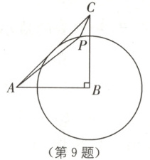 9. 如图所示,在$ \triangle ABC $中,$ \angle B = 90° $,$ BA = BC = 2 $,以$ B $为圆心作$ \odot B $与$ AC $相切,点$ P $是$ \odot B $上任一动点,连接$ PA $,$ PC $,则$ \sqrt{2}PA + PC $的最小值为