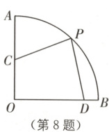 8. 如图,在扇形$ OAB $中,$ \angle AOB = 90° $,$ OA = 6 $,$ C $是$ OA $的中点,$ D $是$ OB $上一点,$ OD = 5 $,$ P $是$ \overset{\frown}{AB} $上一动点,则$ PC + \frac{1}{2}PD $的最小值为