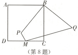 8. 如图,$M$ 是正方形 $ABCD$ 边 $CD$ 的中点,$P$ 是正方形内一点,连接 $BP$,$MP$,线段 $BP$ 以点 $B$ 为中心逆时针旋转 $90°$ 得到线段 $BQ$,连接 $MQ$。若 $AB = 4$,$MP = 1$,则 $MQ$ 的最小值为