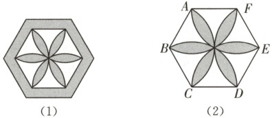 [典例] (山西模拟)平遥推光漆器是山西著名的工艺品,以手掌推出光泽而得名.如图(1)是平遥推光漆器的一个饰品盒盖,图(2)是其几何示意图(阴影部分为花朵图案).已知正六边形$ABCDEF$的边长为$2$,分别以正六边形每个顶点为圆心,其边长为半径画弧,构成花朵图案,则图中阴影部分的面积为(