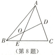 8. (上海徐汇区二模)如图,在$\triangle ABC$中,$D$是边$AC$的中点,点$E$在边$BC$上,$CE = 2BE$,$AE$和$BD$交于点$O$,那么$\triangle BOE$和四边形$OECD$的面积比是