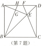 7. 如图,在正方形$ABCD$中,$E$是对角线$BD$上一点,且满足$BE = BC$。连接$CE$并延长交$AD$于点$F$,连接$AE$,过点$B$作$BG \perp AE$于点$G$,延长$BG$交$AD$于点$H$。下列结论:①$AH = DF$;②$\angle AEF = 45°$;③$AH = DE$;④$S_{四边形EFHG} = S_{\triangle DEF} + S_{\triangle AGH}$。其中正确的结论是$\boldsymbol{$