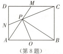 8. (哈尔滨五常一模)如图,在矩形$ABCD$中,$O$是$AB$的中点,$M$是$CD$的中点,点$P$在$AM$上(不与点$A$重合),且$OP = \dfrac{1}{2}AB$,连接$CP$并延长,交$AD$于点$N$。下列结论:①$AP = PM$;②$\angle MAB = \angle PBC$;③若$AN = 1$,$BC = 4$,则$NC = 5$;④$AB^2 = 4NP · PC$。其中正确结论的序号为$\boldsymbol{$